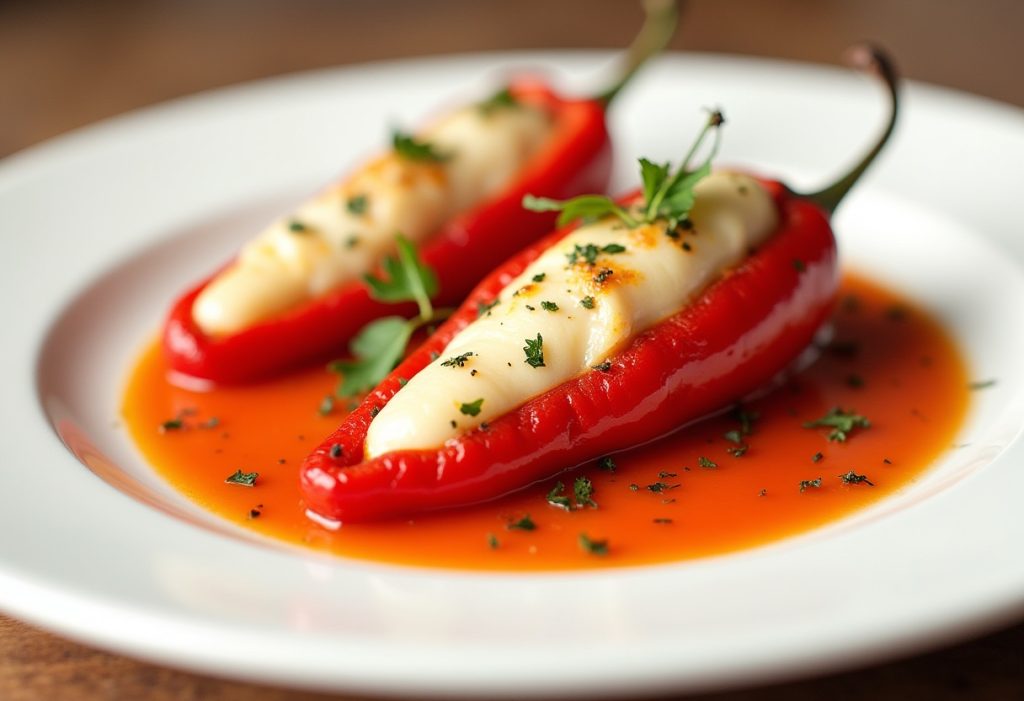 Pimientos del piquillo asados, rellenos de una crema de bacalao y cebolla, servidos con una salsa ligera de tomate. Piquillos
