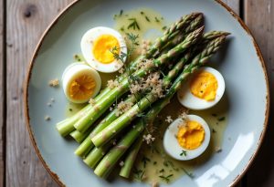 Descripción corta: Espárragos blancos de la huerta navarra, cocidos y servidos con una vinagreta suave de aceite de oliva, vinagre y huevo duro. Dato clave:
